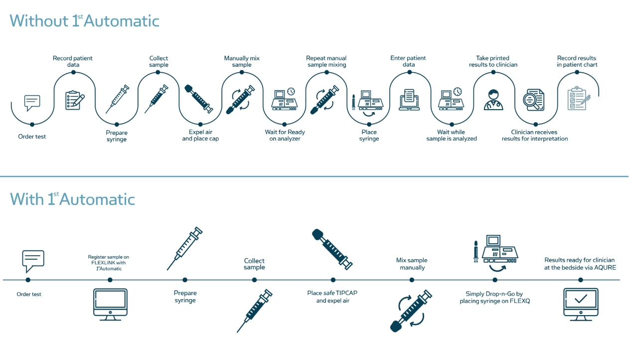 Combine your ABL800 FLEX and safePICO syringes with AQURE's FLEXLINK system to utilize 1st Automatic. The connected solution  registers patient, operator and sample IDs  at the bedside, while FLEXLINK links these data together. An example of how it could expedite your workflow is shown below.