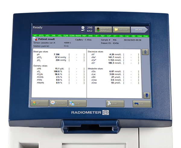 Rapid 19 parameters – including blood gas, metabolites, electrolytes, hemoglobin, and renal. These are measured on the ABL90 FLEX PLUS blood gas analyzer from 1 sample, giving all answers in 35 seconds from 65 μl of blood. The full list of measured parameters is: